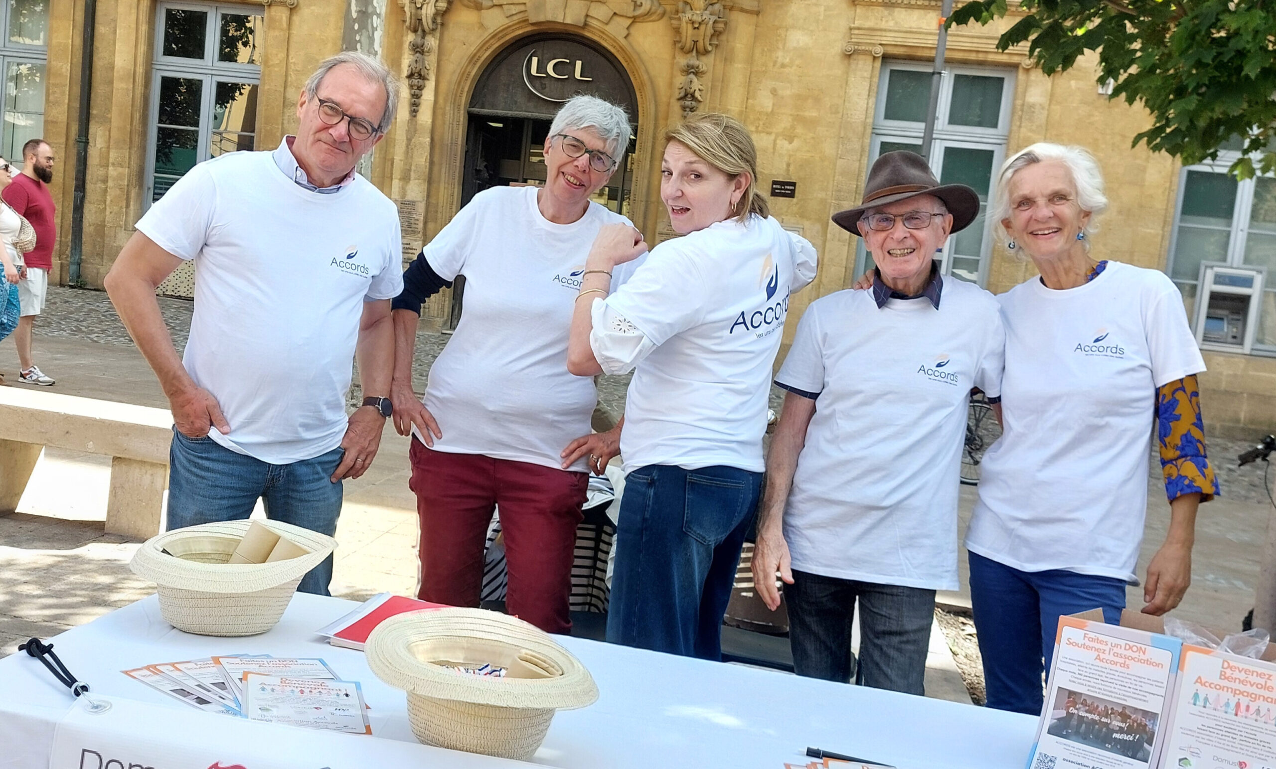 Une joyeuse équipe de bénévole a présenté les actions d’accompagnement des malades lors du Forum des associations et du bénévolat à Aix en Provence. Merci à Rose, Jean Pierre, Frédérique, Mireille, Philippe et Corinne qui ont rencontré de nombreux aixois et , parmi eux, nous l espérons des futurs bénévoles Accords. Des rendez vous ont été pris pour des entretiens d échange avec des accompagnants expérimentés, en vue d intégrer le cycle de formation.